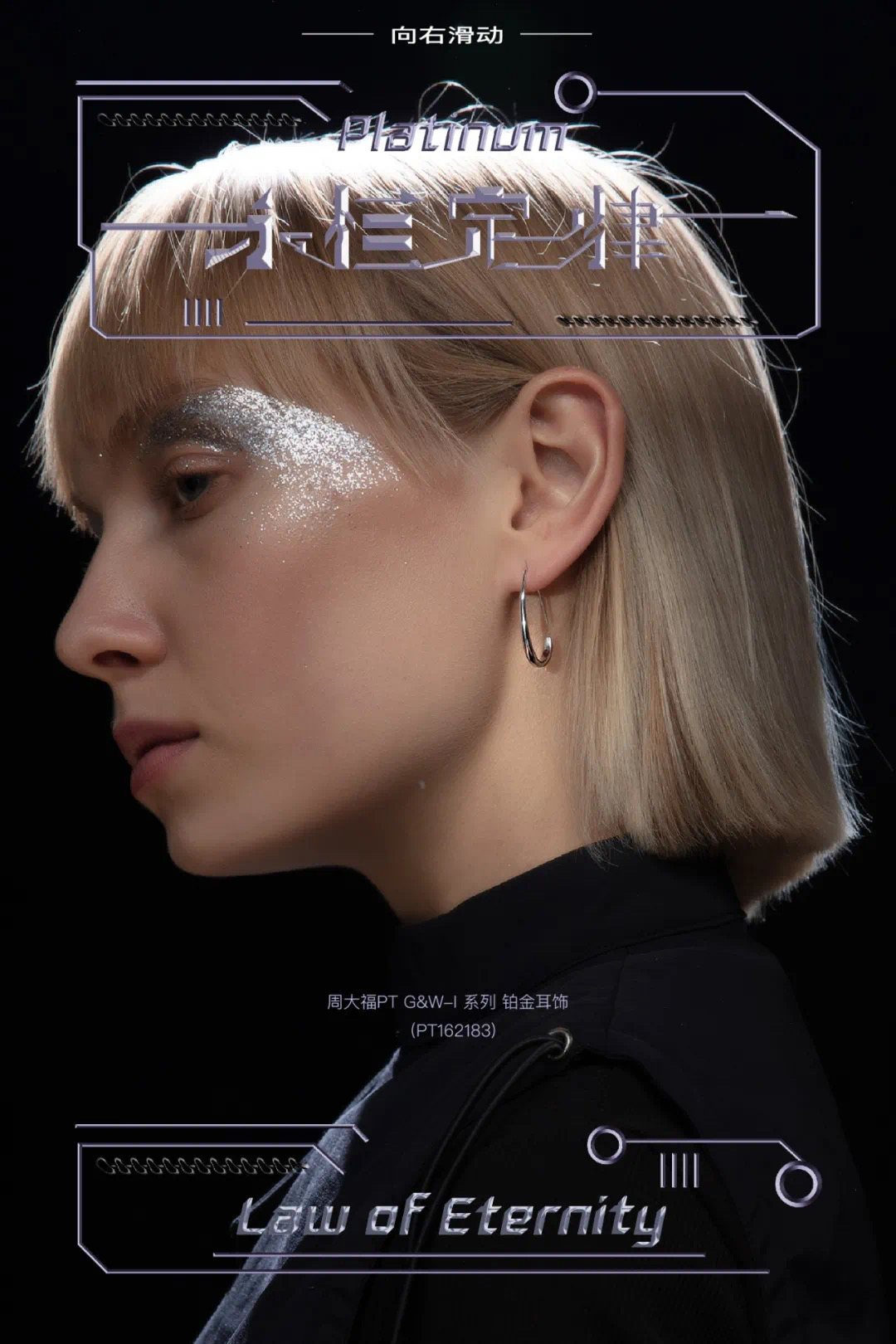 周大福本次的新品主打“铂金潮流“概念,视觉上采用未来感的审美语言,体现铂金质感, 加入cyber punk 元素,使周大福产品更年轻化,时尚化, 营造出给人眼前一亮的视觉新信号.